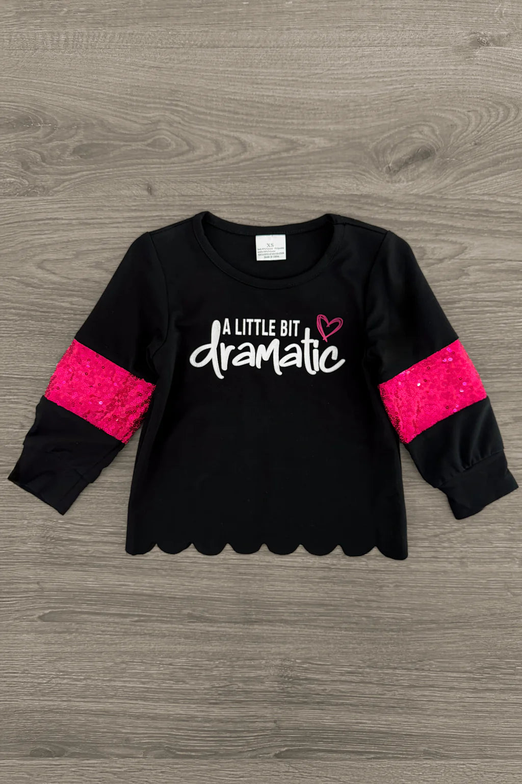 Bring on the cooler weather with this "A Little Bit Dramatic" Striped Denim Flare Set for girls. The black long sleeve top features a fun saying on the front and looks adorable paired with the denim pants. The stretchy waistband helps comfort and fit and can be great for on the go, while the pink stripes add a fun touch.