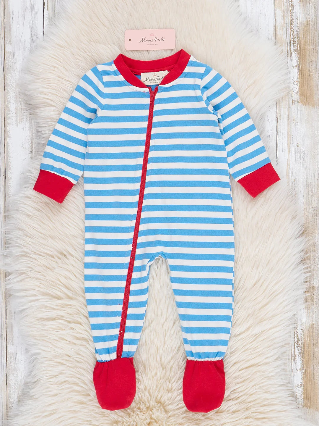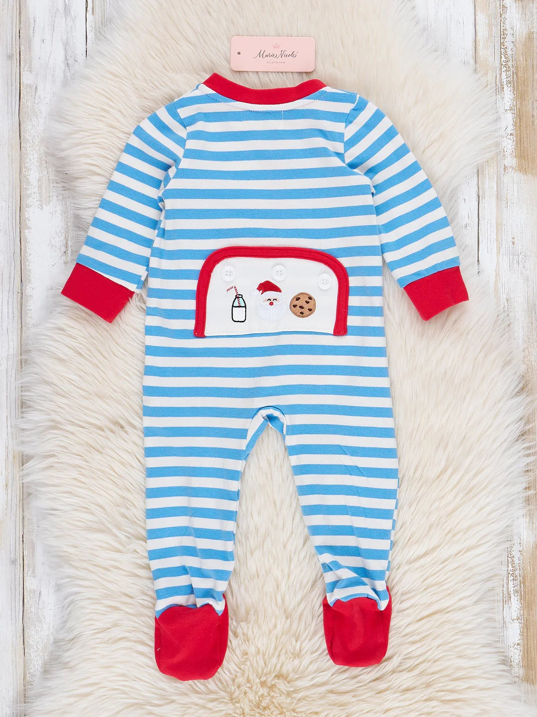 Blue Striped Embroidered Santa Cookies Footed Sleeper Pajamas
