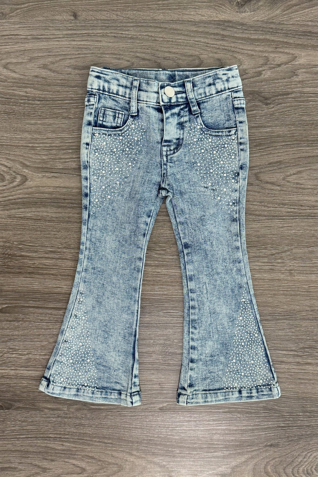 - Denim flare pants feature a stretchy waist with sequins